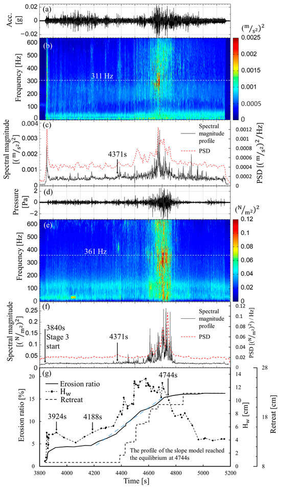 (a) Acceleration, Acc 2; (b) time–frequency spectrum of Acc 2; (c) spectral magnitude profile of 311 Hz and PSD of Acc 2; (d) sound pressure, Mic; (e) time–frequency spectrum of Mic; (f) spectral magnitude profile of 361 Hz and PSD of Mic; (g) the erosion ratio, run-up height of wave (Hw), and retreat.
