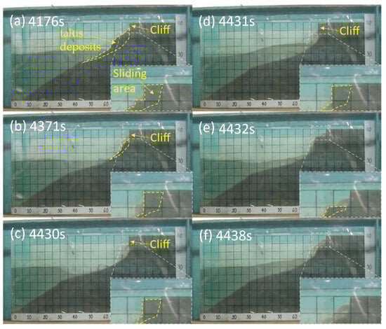 Figure 15 shows the changes in slope profile during 4176 s–4438 s. According to Figure 15a–c, as the waves erode, the upper part of the slope gradually forms a steep cliff due to the decreasing amount of “talus deposits”. The term “talus deposit” refers to materials from the upper slope that accumulate on the surface after sliding and/or collapsing, without being backwashed into the water. As shown in Figure 15a, the talus deposits covering the slope surface had previously experienced sliding but had not yet been eroded away due to the limited range of wave erosion. Because this talus deposit had experienced sliding, its structure was loose and easily eroded away as the range of wave erosion increased due to Hw rising (Figure 15b), even if the force of wave erosion was weak. This helps further explain why the energy of seismic and acoustic signals did not increase at high erosion ratios during 4188 s–4371 s. As most of the talus deposits were eroded away (Figure 15a,b) during 4176 s–4371 s, waves subsequently began to erode previously unaffected areas of the slope. Since the type of wave erosion began to change from swash to impact after 4371 s, this caused the spectral magnitude and PSD of both seismic and acoustic signals to begin to rise (Figure 14c,f).