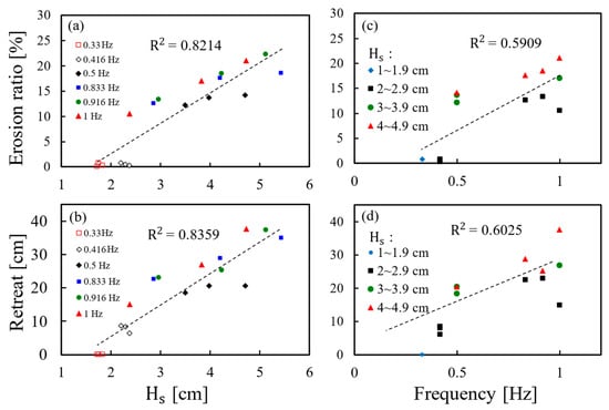 Duration 0–900 s: (a) erosion ratio vs. significant wave height, Hs; (b) retreat vs. Hs; (c) erosion ratio vs. wave frequency; (d) retreat vs. wave frequency (the dotted lines represent the trend lines).