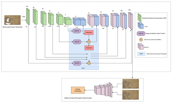 RG-GAN is tailored to restore images with a high degree of fidelity, particularly focusing on ancient paintings where the preservation of historical and artistic integrity is paramount. As shown in Figure 1, RG-GAN consists of a multiscale fusion generator and a global context perception discriminator. The encoder of the generator is responsible for converting damaged or incomplete ancient images into a set of feature representations. The decoder of the generator then uses it to reconstruct the image and fill in the missing areas [25]. It ensures that the high-level semantic features captured by the encoder are effectively transmitted and maintained during the reconstruction process, thus solving the problems of semantic incoherence and missing high-level feature information. The discriminator is used to identify subtle differences between the inpainting results and the real ancient painting images [26] and provide feedback to the generator to guide it to generate more realistic and consistent images, further improving the quality and artistry of the inpainting results.