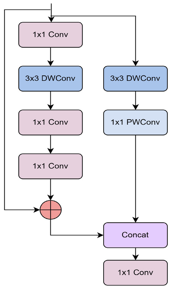 where DWConv3 refers to the 3 × 3 depth-wise convolution, PWConv1 denotes the 1 × 1 pointwise convolution, Conv3 and Conv1 represent the standard 3 × 3 and 1 × 1 convolutions, respectively, Cat is the concatenation operation, and ⊕ indicates element-wise addition.