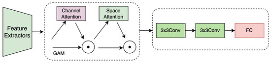 The structure design of GCPD is shown in Figure 5, which consists of several key parts: feature extractor, global attention module (GAM), convolution module, and full connection layer FC. Specifically, the feature extractor is composed of two branches—the left branch is composed of three continuous 3 × 3 convolution layers, which are used to extract initial visual features from the input ancient painting images, and the right branch further deepens the feature extraction process by using 3 × 3 and 1 × 1 convolution so that the network can capture more subtle and complex ancient painting image features. Then, the features extracted from the two branches are fused, and the number of channels is adjusted by a 1 × 1 convolution. Then, the global attention mechanism is applied to capture the key multi-dimensional features of the image and retain the information of the channel and spatial dimensions. This design not only reduces the model size of the convolutional neural network but also improves its performance, making GCPD more efficient and accurate in evaluating generated images.