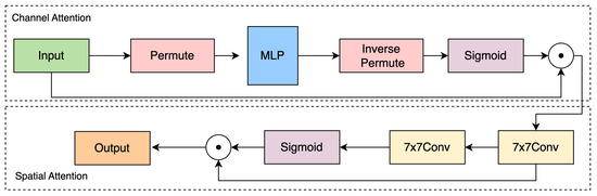 where is the sigmoid activation function, whose mathematical definition is , MLP refers to a shared perception machine, and Permute and InversePermute are used to rearrange the order of feature dimensions. Specifically, Permute reorders the dimensions of the input tensor to facilitate certain operations, and InversePermute restores the original dimension order after processing. The symbol ⊙ represents an element-by-element (or pixel-wise) multiplication, and denotes convolutions with a 7 × 7 kernel size.