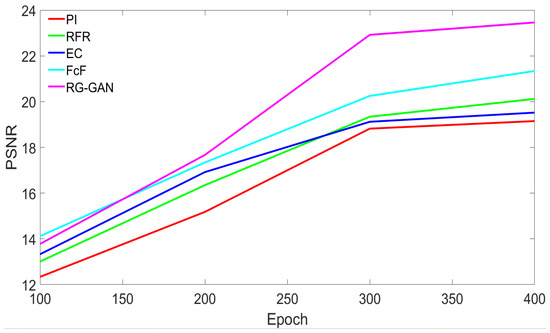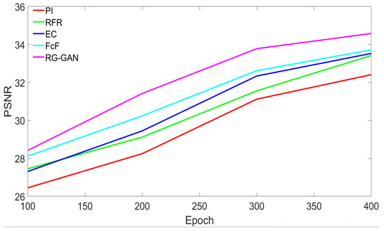 From the results of the comparison of the five methods on the PSNR indicator in Figure 7, it can be observed that RG-GAN has achieved the best results during training compared to other methods. The PSNR and SSIM metrics of our method reached 34.37 and 0.928, respectively, the highest values in all models, and the MSE and LPIPS metrics achieved the lowest values. This is because the model combines stable field operators and multi-scale cross-layer fusion techniques. We have solved the problem of the U-Net model dealing with invalid pixel transfer in missing areas. This enables the decoder to leverage feature information from different levels. This improves the inpainting quality problems caused by a lack of high-level semantic features. In addition, this paper proposes a new Global Context Perception Discriminator, which enhances the ability of the global attention mechanism in spatial localization and detail extraction and improves the performance of the model in various inpainting tasks.