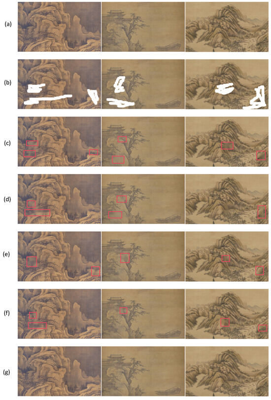Figure 8 shows the visualization results of different methods on landscape painting datasets. As can be seen, Figure 8c,d have lost details and exhibit blurred edges during image inpainting, resulting in poor inpainting results. Figure 8e,f show incoherent inpainting results in the missing areas of the image during the inpainting process. In contrast, our method produces higher-quality inpainting images compared to other methods. The preservation of edge details is particularly prominent in optimal inpainting.