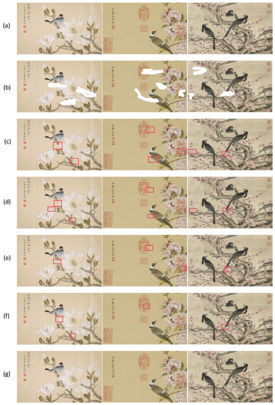 Image inpainting effects of different methods on the ancient Huaniao++ dataset: (a) the ground truth image, (b) the input image, (c–g) the image inpainting results for PI, RFR, EC, FcF, and our method, respectively. The visual comparison, with red boxes highlighting key areas, clearly shows RG-GAN’s ability to handle the intricate patterns and textures of traditional Huaniao paintings more effectively than the other models.