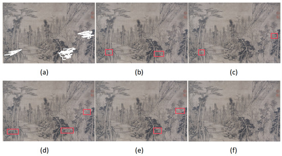 Figure 10 shows the visualization results of different methods on the ancient Huaniao++ dataset. As can be seen from Figure 10, there is a certain degree of ambiguity in the inpainting results of Figure 10c–f in terms of improving the fuzziness of the repaired images; however, there is a loss of detail features. In contrast, our method produces better results than other image inpainting methods, showing a semantically consistent repair for missing regions and excellent inpainting results in image detail and edge texture.