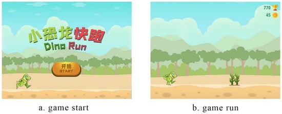 Twenty-nine participants (13 males, 16 females) with aged 22 to 35 years (M = 25.9, SD = 3.3) were recruited online for this research. All of them were right-handed and had normal or corrected vision. They were graduate students at Hunan University. At the beginning of the experiment, all subjects were informed of the experimental procedure and asked to fill out a basic information questionnaire. The main elements included gender, age, education, average daily game hours, and whether they had played Dino Run or a similar parkour game. The average time they spent playing was 1.38 h (SD = 0.97) per day. They all had played Dino Run or similar games. However, they do not play the game used in this study, as it was a redesigned and developed version of the original game. Before the experiment, they signed the informed consent voluntarily. Upon finishing the experiment, they would receive a gift to appreciate their participation.