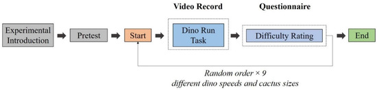 To mitigate the order effect, we randomly disrupted the order of the games before the formal experiment started. The experimental procedure is detailed as follows: Participants enter the game interface after clicking the start button or pressing the space key. During gameplay, they tap the space key to jump over the cactus. If the user does not avoid a cactus, the number of failures increases by one, and the game continues. The duration of each game is 30 s. After completing one mode, the game returns to the initial interface. Users need to rate the difficulty on a scale from 1 to 9, where 1 means extremely easy, 5 represents normal (neither easy nor hard), and 9 indicates very hard. Then, they take a break for about 1 to 2 min to prevent fatigue. Afterward, users enter the game in a different mode by pressing the start button again. The entire experiment took about 15 min, and we only recorded users’ facial data while they were playing. We used the number of failures (touching the cactus) and the score as indicators of the game performance. The lower the number of failures, the smoother the user’s gameplay was in that mode.
