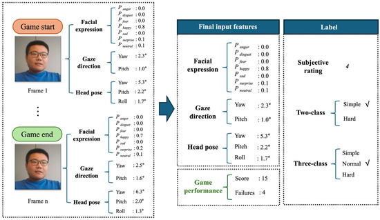 After completing each game mode, we recorded the player’s game performance, including the score and the number of failures. Then, we combined the averages of their facial cues and game performance as the final input features. Thus, we obtained 14-dimensional features (facial expression: 7, gaze direction: 2, head pose: 3, game performance: 2). Finally, we built a game difficulty prediction dataset with these features as inputs and the users’ subjective difficulty rating scores as labels. Figure 4 shows an example of generating a dataset sample from a test video containing n-frame images. The first column shows the facial cues computed in each frame, the second column displays the average results of each facial feature and the game performance, and the last column shows the subjective difficulty rating and the corresponding difficulty category. The mapping rules between the subjective difficulty rating and the difficulty category will be described in detail in Section 3.5.