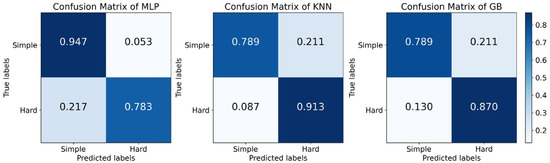 Table 4 reports the performance of these methods on the two-class classification task. Since the discrepancies among the four evaluation indicators in each classifier are relatively small, we do not present the results in graphical form. From the table, we observe that MLP achieved the highest results on all evaluation metrics, and the values of these metrics were over 0.85. The performances of KNN and GB were slightly lower than that of MLP and separately ranked second and third. Additionally, AB achieved the poorest performance, with all the metrics below 0.7. Further, we use the confusion matrix to analyze the performance of these methods in each category. Figure 6 shows the confusion matrices for the top three methods, including MLP, KNN, and GB. We observe that MLP performs well in predicting the “simple” class but is mediocre for the “hard” class. In contrast, KNN and GB achieved higher accuracy in predicting the “hard” class. The reasons why MLP performs poorly in the “hard” class may be due to the following reasons: 1. The model structure might be too complicated for the two-class classification task, leading to overfitting when training on the dataset since we used the default parameters for the MLP classifier. 2. MLP is sensitive to the choice of initial training weights and bias, which may cause the model to become stuck in local optima, leading to a divergence in the training process [37,38]. In future studies, we will further explore the effects of different training parameters, the number of neurons, and the number of hidden layers on the classification performance.