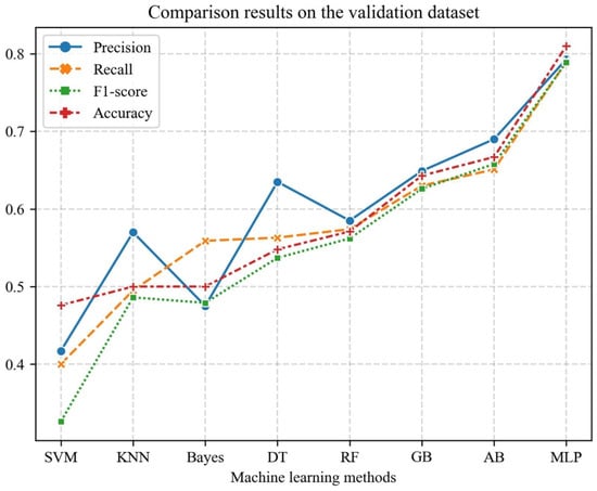 We divided the collected dataset into two parts: the training dataset and the validation dataset. The ratio between them is 4:1. Then, we trained several machine learning classifiers on the training dataset, including support vector machine (SVM), k-nearest neighbors (KNN), Naïve Bayes, decision trees (DT), random forest (RF), gradient boosting (GB), Adaboost (AB), and multilayer perceptron (MLP). These methods were implemented using Sklearn [36] and trained with default training parameters. The following sections present the comparison results of these methods on the validation dataset.