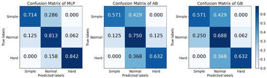 Figure 7 reports the performance of these methods on the three-class classification task. We observe that MLP achieves the highest results on all four evaluation metrics, and the values of these metrics were close to 0.8, while those of other methods were below 0.7. The results indicate that MLP is more suitable for predicting game difficulty than the other methods in the three-class task. In addition, surprisingly, KNN, which achieved satisfactory performance on the two-class classification task, does not perform well on the three-class task. Additionally, AB, which achieved the worst performance on the two-class classification task, is ranked second on the three-class task. These results imply that the same methodology could perform differently on different tasks. Figure 8 presents the confusion matrices for the top three methods: MLP, AB, and GB. We observe that the accuracy of all three methods in predicting the “simple” class is inferior to that of the remaining two classes. This disparity could be due to the small sample size of that class in the dataset. An imbalanced dataset significantly restricts the estimation performance of the model [39]. In addition, MLP achieves high prediction accuracies (exceeding 80%) on both the normal and hard categories. Although its accuracy in the “simple” class is only 0.714, it also outperforms AB and GB by a large margin. The results reveal the advantage of MLP in handling complex tasks.