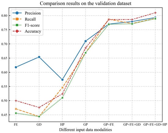 From the above results on the two-class and three-class tasks, we observe that the latter task is more difficult. Therefore, we used the three-class task to conduct an extra experiment to verify the differences in classification performance from different input data modalities. Since MLP demonstrated better performance on these tasks, we used it as the classifier.
