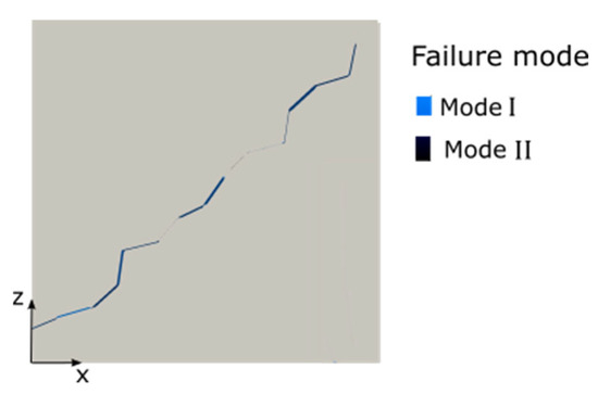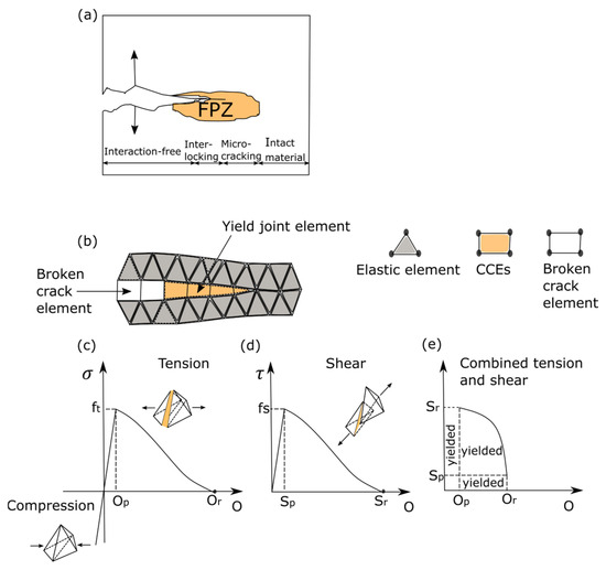This method enables the transition from a continuous to a discontinuous domain as fractures initiate and propagate. The intact material begins with a distributed micro-crack zone at the crack tip called a fracture process zone (FPZ), representing the initial damage (Figure 1a). This process then progresses to a bridging zone, where interlocking phenomena help distribute stresses across the cracks (Figure 1b). Finally, it transitions to a traction-free macro-crack zone, where the material completely separates. This sequence is marked by the Mode I crack walls beginning to separate between elements once the bond stress threshold (ft) is reached (Figure 1c). As the separation grows, the bonding stress between the elements decreases accordingly, ultimately dropping to zero once the separation surpasses a critical threshold (Or). Propagation under mode II fracture initiation occurs when the tangential slip at an integration point, denoted as s, attains a critical threshold sp, which aligns with the element’s intrinsic shear strength fs (Figure 1d). Lastly, crack elements in the FDEM can undergo mixed-mode fracture behavior (Figure 1) when Mode I and Mode II displacements interact (Figure 1e). The model continuously updates the stress and displacement fields to reflect the crack opening and the relative sliding of the faces.