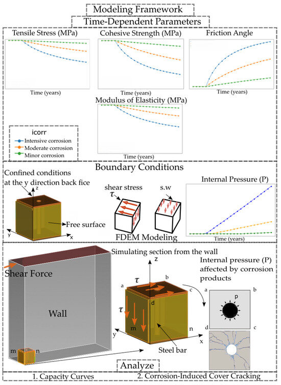 This model represents the seismic event as shear stress (τ) applied on the shear faces of the cube. Furthermore, the face connected to the back side of the wall is confined in the y-axis due to the continuum connection to the wall, and acts as a roller in the other directions. Finally, the remaining surface is left free, with no applied forces or continuous conditions, as shown in Figure 1. The shear stresses are applied incrementally until failure by applying velocity conditions in the shear direction (note that the self-weight of a single wall, compared to the shear forces generated by a seismic event, is negligible, and the rotation of the cube section is also relatively small based on Mohr’s circle analysis). The simulation process is repeated every ten years, during which the internal pressure is recalculated with increasing values, and degraded mechanical parameters are assigned. It is important to note that we considered the limitation that corrosive products become active after 20 years, as suggested by [57,58], and therefore, degraded parameters are only applied after this period. Since we modeled the time intervals in years discretely/discontinuously, applying shear forces continuously until failure at each time interval, it is difficult to transfer the material properties degraded by cracks from one-time interval to the next. We relied on the empirical equations presented in Equations (1)–(8) to address this limitation. While this approach provides a reasonable approximation, it highlights the potential for future work to enable the continuous transmission of material property information across time steps.