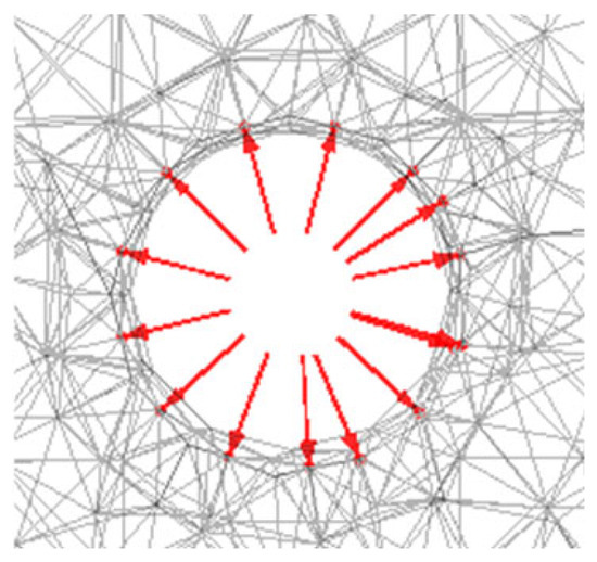 For simplicity, the impact of the steel embedded in the concrete (rebar stiffness) was omitted in the model. However, radial pressure resulting from the corrosion of corroded steel was integrated into the model. This pressure, derived from Equation (18), was applied around a “cylindrical hole” at the external meshing points (see Figure 3). The pressure simulates the expansion of rust, particularly around the interface layer of the steel, which creates a significant force on the surrounding concrete, leading to internal stresses within the boundary layer. These stresses, represented as radial pressure in the simulation, can induce cracking and spalling in the concrete, ultimately weakening the wall’s structural integrity.