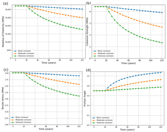 Additionally, the friction angle (Figure 4d) increases over time, indicating a shift towards more brittle behavior, particularly under intensive corrosion where material failure becomes more abrupt during seismic loads. As depicted in Figure 4, these time-dependent degradation patterns are critical for the model’s simulations. These parameters will affect the structure’s ability to resist seismic forces, as presented in Section 3.4.