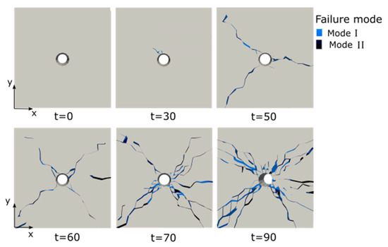 After assigning the mechanical parameters to the models and applying the boundary conditions, each model was subjected to increasing shear stress until failure. Crack patterns were observed at the capacity stress level during the structure’s lifecycle, captured at each time interval on the surface where the rebar appears as circular features, illustrating the various stages of this process.