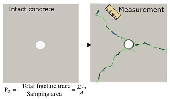 Figure 5 illustrates the progression of cracking on the concrete surface surrounding the rebar at various stages in the structure’s life cycle, with the estimated cracking relative to the total cross-sectional area increasing over time. Using the areal fracture intensity method, we quantified the extent of fracturing to assess its impact. Using the measurement technique, developed by [72], to quantify fractures in discrete fracture analysis. The intensity of the areal fracture, denoted as P21, is the ratio of the total length of the fracture traces to the cross-section (see for a schematic measurement of the fracture trace).