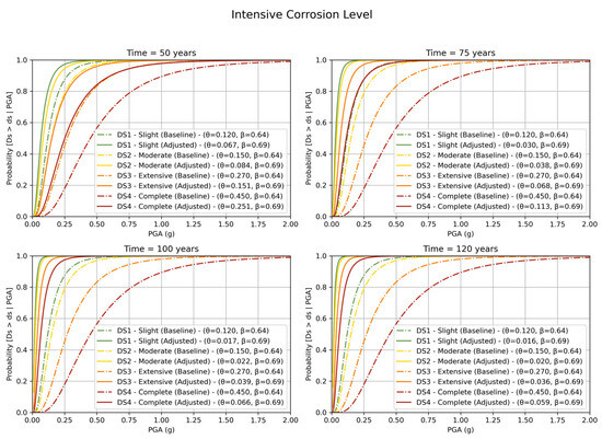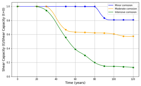 Furthermore, corrosion is a time-dependent process [54,55], meaning the impact of corrosion on structural capacity constantly increases as the RC elements age. This highlights the importance of ongoing, time-dependent assessment and the monitoring of RC elements to obtain a comprehensive understanding of the seismic risk to CI.