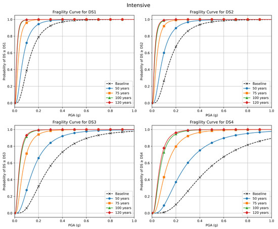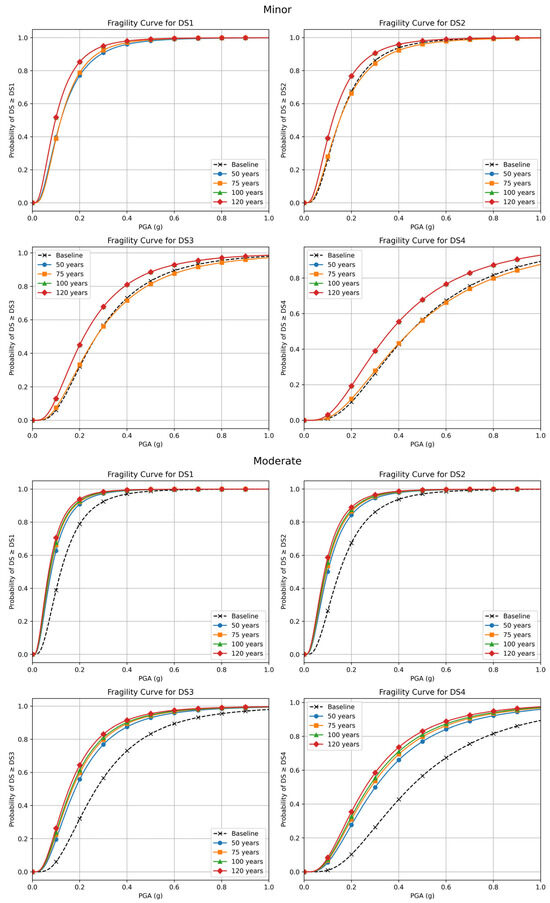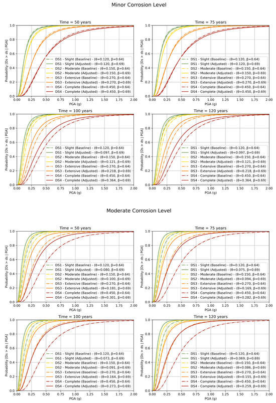 A common tool for assessing the seismic vulnerability of CI is the use of seismic fragility curves. A fragility curve represents the probability that a structure or a component will exceed a certain damage state as a function of an earthquake’s intensity measure parameter [12]. Fragility curves are usually derived using the empirical approach or analytical approach. The empirical approach relies on the observations of post-earthquake damage to develop fragility curves [13,14,15,16,17,18], while the analytical approach uses computer simulations, like pushover and time–history analyses [19,20,21,22]. However, most of the traditional fragility curves are developed based on the structural response without explicitly accounting for actual conditions and long-term degradation processes, such as corrosion. These curves often assume that the structures are in a “like-new” or adequately maintained condition, failing to distinguish between structures in good condition and those suffering from degradation. This lack of distinction can lead to significant misinterpretation in the risk assessment process and potentially mislead the risk management strategies. By not accurately representing the varied conditions of infrastructure, particularly those degraded by factors like corrosion, fragility curves might underestimate the actual vulnerability, creating significant challenges for the effective planning and prioritization of mitigation strategies.
