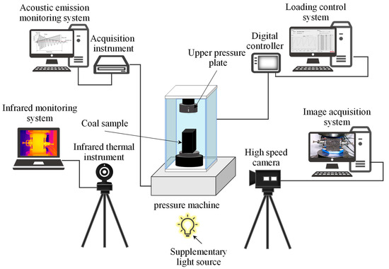 The IR method for coal rock offers the advantages of intuitive images, real-time monitoring, and non-contact, and it has been successfully applied to monitor coal mass damage and failure [9,10]. The IR of coal rock is mainly caused by the temperature changes resulting from crack propagation effect, friction effect, and thermoelastic effect [11,12,13,14]. In general, coal rock shear failure and internal friction effects typically result in an increase in IRT [15], while tensile failure generally leads to a decrease in IRT [16]. Currently, extensive research has been conducted on the IR characteristics of coal rock failure, the influence of fracture modes on IR, IR signal denoising, the quantitative relationship between IR and coal rock damage, and IRT and area precursor indicators [17,18,19,20], and certain results have been achieved. Tang et al. [21] employed IR experiments and particle flow PFC2D simulation methods to investigate the influence of the degree of damage on the IRT variation in the coal. Before the coal instability, the IRT of the coal with greater strength exhibited a sudden increase, whereas the IRT of the coal with less strength initially decreased and then increased. Khan et al. [22] studied the IRT variation in sandstone failure under both uniaxial and shear loading modes and found that the AIRT increased during shear failure and the AIRT decreased during tensile failure. Ma et al. [23] established a quantitative relationship between coal rock damage microelement failure and IR parameters and quantitatively characterized coal rock damage using IR parameters. Impact-prone coal fails more rapidly than non-impact coal, the precursor characteristics are more inconspicuous, and the prediction of rock bursts is more difficult [24,25,26]. Therefore, the damage status and instability IR precursor characteristics of different coal impact types need to be revealed.