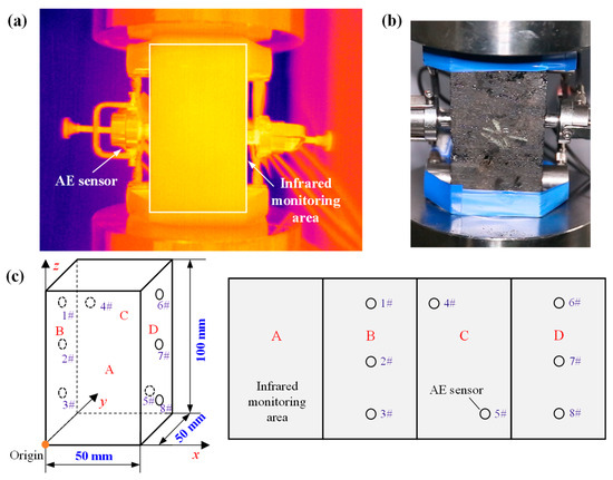 The IR and AE test system for coal failure is shown in Figure 1, which mainly includes three parts: loading control, IR monitoring and AE monitoring. The IR monitoring area and the layout of the AE sensors is shown in Figure 2.