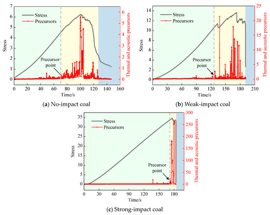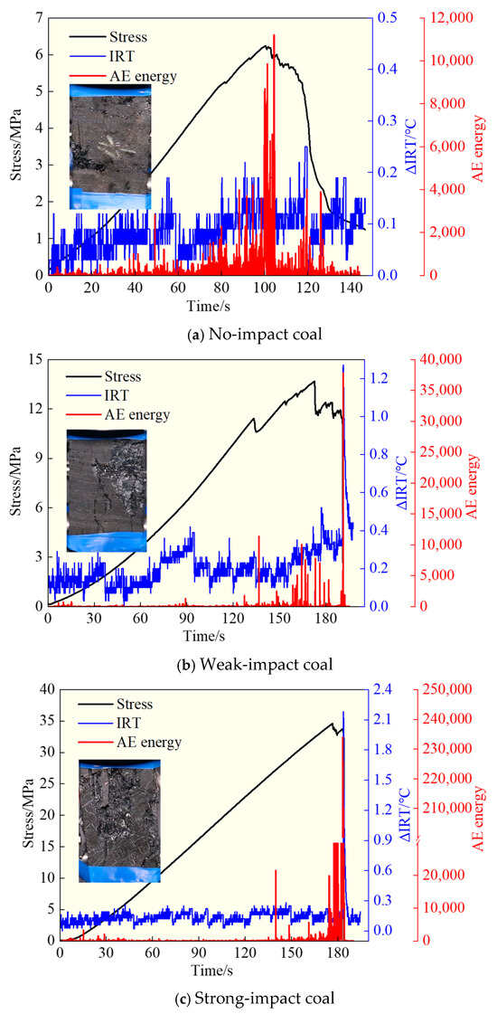 The AE signal, which contains abundant information on coal failure [27,28,29], is widely used in monitoring coal damage and rock bursts. The AE time series and frequency domain distribution correspond to the damage state and fracture scale of the coal rock [30,31]. Before the failure of the coal, the AE time series signals (count, energy, amplitude) rapidly increases and the main frequency rapidly decreases. The spatial location of the AE corresponds to the damage and fracture location of the coal mass. In the concentrated area of the coal rock fracture, the AE positioning points are dense and have high energy. Recently, some scholars have used the RA-AF characteristics of the AE to predict the fracture modes of coal and rock at different stages [32,33,34]. Tensile failure AE signal duration and rise time are short, AF value is high, and RA value is low, while the shear crack AE signal duration and rise time are long [35]. In coal and rock disaster monitoring, the combined IR and AE method is helpful to accurately and effectively analyze the damage and failure state of the coal mass. Liu et al. [36] used the impact number of the AE and IR change rate to classify the stages of sandstone crack evolution, thereby identifying high- and low-damage zones in the sandstone. Zhang, Chen et al. [37,38] found that the AE appeared later than the IR signals. Combining AE and IR monitoring can avoid the lag of the AE and the spatial limitations of IR. Currently, the comprehensive monitoring of IR and AE mainly focuses on the same type of coal, and there is little research on the relationship between the IR, AE, and damage status and instability precursors of different impact types of coal bodies.