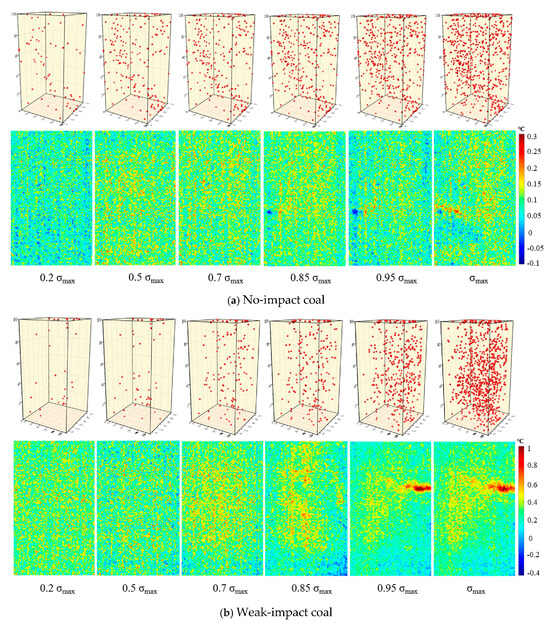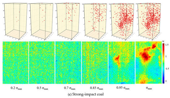 As shown in Figure 4a, at the initial loading stage of 0.2σmax for no-impact coal, the AE localization points are relatively scattered, and the IRT distribution is uniform. As the stress increases, at 0.5σmax–0.85σmax, the IRT rises, and the AE localization points gradually increase, but the distribution is still scattered. At 0.95 σmax and σmax, the AE localization points continue to increase, and the IRT of the coal body further rises, but there is no high-temperature concentration area. As shown in Figure 4b, weak-impact coal exhibits a small number of AE localization points at 0.2σmax–0.5σmax, and the IRT distribution is uniform. As the stress increases, the AE localization points and IRT gradually increase. When reaching 0.95σmax, the AE localization points become dense and the infrared high-temperature area becomes concentrated. At σmax, the coal body becomes unstable and fails, resulting in a dense appearance of numerous AE localization points. As shown in Figure 4c, strong-impact coal only produces a small number of AE localization points before 0.7σmax, and the IRT distribution is uniform without significant changes. After 0.85σmax, the number of AE localization points and IRT rapidly increase, and the high-temperature area becomes concentrated. At σmax, the strong-impact coal undergoes impact failure, with a large number of AE localization points and infrared high-temperature concentration areas appearing in the middle of the coal body.