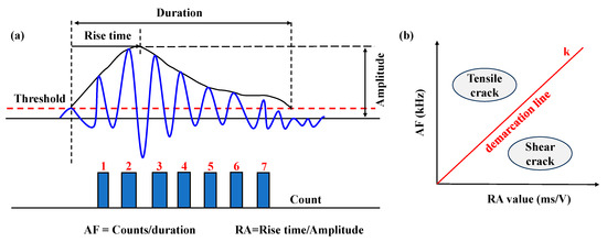 The RA-AF distribution of the AE can reflect the damage status and failure mode of the coal rock [40,41]. The tensile failure AE signal duration and rise time are short, AF value is high, RA value is low, while the shear crack AE signal duration and rise time are long. Shear failure, on the contrary, has a long duration and rise time of the AE signal, high RA value, and low AF value [42,43,44]. A typical coal rock AE waveform information and RA-AF crack classification are shown in Figure 5. Among them, AF is the ratio of AE counts to duration (Equation (1)), and RA is the ratio of AE rise time to amplitude (Equation (2)).