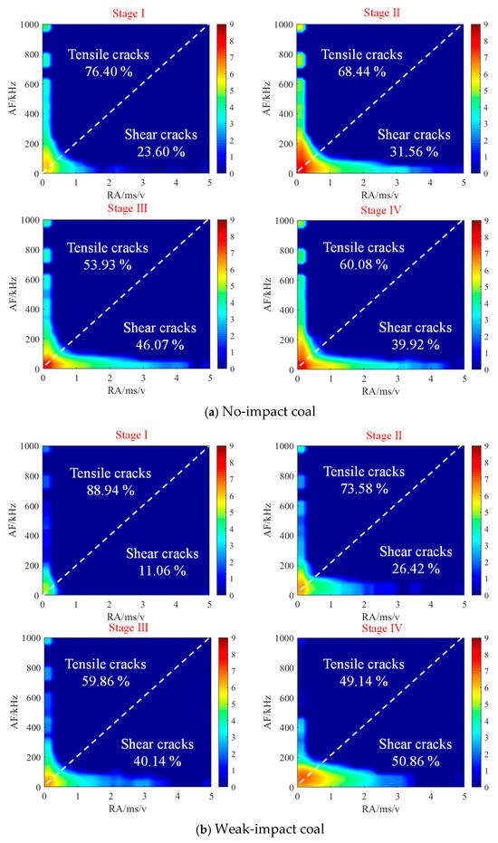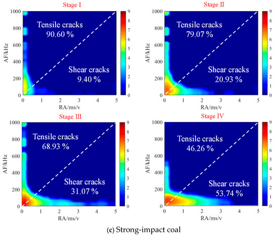 Relevant scholars have studied the slope of the RA-AF boundary line k and found that the value of k is generally 100–500 times that of the coal and rock materials [45,46,47]. This paper takes k = 200 as the dividing line to analyze the failure modes about different coal impact types. Cracks above k = 200 are classified as tensile cracks, while those below are classified as shear cracks. For convenience of analysis, based on the stress variation law of coal, the process of coal failure under load is divided into four stages: (I) compaction stage, (II) elastic stage, (III) plastic stage, and(IV) failure stage. The damage status and failure mode of the different coal impact types are shown in Figure 6, and the proportion of tensile and shear cracks is shown in Table 3.