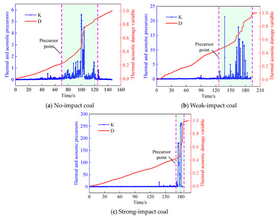 - The combined IRT and AE sensitivity index K for different coal impact types is established. As the impact tendency increases, the IRT and AE sensitivity gradually increases, but the occurrence time of the failure precursors becomes later and later. The IRT and AE sensitive instability precursor of no-, weak-, and strong-impact coal appear as 55.2%, 66.3%, and 93.4%, respectively, of the coal instability and failure.