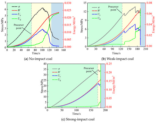 The energy evolution during the loading process of the different coal impact types is calculated using Equations (22)–(24), as shown in Figure 9. No-impact coal exhibits a high degree of primary pore and fracture development, strong connectivity, and soft texture, with certain plastic characteristics [59,60]. During the loading process, the particles and cracks in the coal body undergo friction with each other, the internal energy is slowly released in the form of dissipated energy, and the IRT and AE signals gradually increase (Figure 9a). The weak-impact coal has a lower degree of development in its primary fissure structure, weaker connectivity, and a denser structure. The skeleton has a certain load-bearing capacity and exhibits overall brittle characteristics [59,60]. In the early stages of coal loading, the external input energy mainly accumulates in the form of elastic energy, and the released dissipated energy and generated IRT and AE signals are relatively lower. Due to the brittleness of coal, when the stress drop occurs, cracks in the coal body rapidly develop and expand, and the dissipated energy increases rapidly, corresponding to a sudden increase in IRT and AE signals (Figure 9b). The pore and fracture development degree of strong impact coal is very low, with a dense and hard structure and strong load-bearing capacity of the skeleton [61]. In the early stages of coal loading, the externally input energy is almost entirely stored in the form of elastic properties inside the coal body, and the dissipated energy hardly increases. At the moment of coal failure, the accumulated elastic energy is rapidly released and converted into dissipated energy, resulting in a rapid increase in IRT and AE signals (Figure 9c).