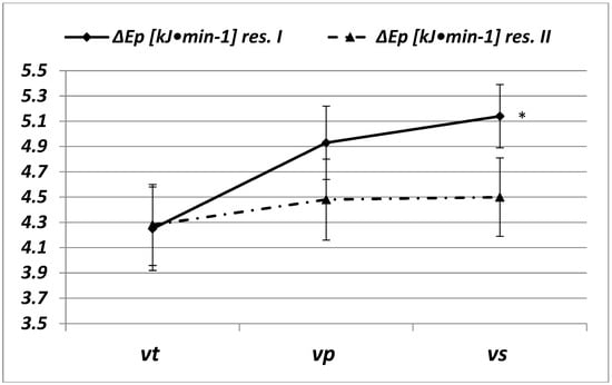The average values of the potential energy changes (ΔEp) in the second study at technical (vt), threshold (vp), and racing (vs) speeds, * p < 0.05.