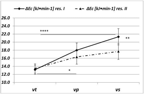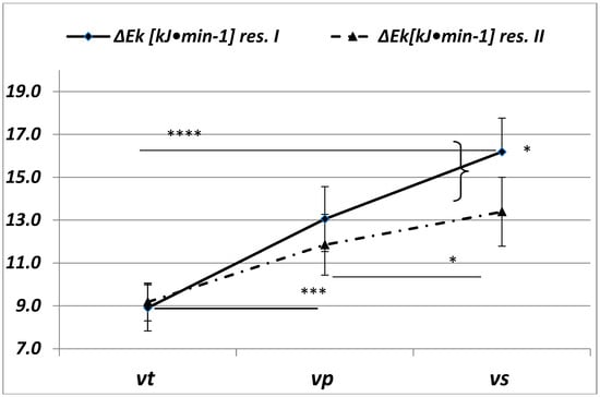 The average values of the kinetic energy changes ΔEk, at technical (vt), threshold (vp), and racing (vs) speeds, * p < 0.05, *** p < 0.005, **** p < 0.001.