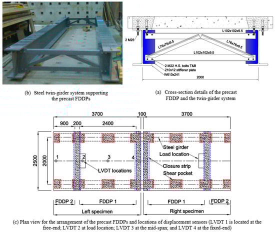 The experimental program included testing two laterally restrained precast FDDPs supported over a braced twin-steel girder bridge system shown in Figure 2a. The steel I-girders were 7500 mm in length and made of W610 × 241. They were placed over 330 × 330 × 25 mm elastomeric pads supported over steel pedestals, making the clear spacing of the girder equal to 7000 mm. Transverse cross-type bracings were installed at the two ends of the steel girders to provide lateral restraints to the deck slab as specified in the CHBDC empirical design method. The spacing of the twin girders was 2000 mm, measured center-to-center of the girders. Figure 2b shows cross-section details of the precast FDDP resting over the twin girders and connected to it using shear connectors. The M25 high-strength bolts are used for the panel-to-girder connection. The precast FDDP’s width was 2500 mm so that it could be supported over the twin girders to produce a slab span of 2000 mm, as depicted in Figure 2c. The precast FDDPs had a 200 mm thickness and were made of 35 MPa normal strength concrete (NSC) with a 10 mm nominal size aggregate, a 150 mm slump with added superplasticizer, and no air-entrant.