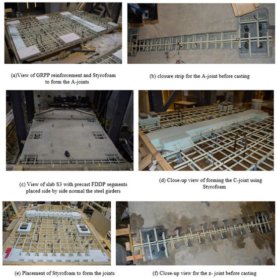 Straight-ended, 16M ribbed-surface HM GFRP bars reinforced the precast FDDP, per CHBDC requirements. The slab’s bottom and top transverse reinforcement were taken 16M bars @ 140 mm and 16M bars @ 200 mm, respectively. The slab was reinforced with 16M bars @ 200 mm in the bottom and top longitudinal direction (i.e., parallel to the girder). The properties of the materials of the HM GFRP bars are listed in Table 1. The specified ultimate tensile strength and modulus of elasticity of the GFRP bars were 1188 MPa and 64 GPa, respectively [57]. Two precast FDDPs were formed first to form the joint between the precast FDDPs. The first precast FDDP was of 200 mm thickness, 2400 mm length in the girder direction, and 2500 mm width, while the second precast FDDP was of 200 mm thickness, 1000 mm length in the girder direction, and 2500 width. Those two FDDP segments are shown as FDDP 1 and FDDP 2 in Figure 2c. This made the final length of the jointed slab 3700 mm in the direction of traffic. It should be noted that the short precast FDDP of 1000 mm was introduced beside the large precast FDDP in Figure 2c to ensure deck slab continuity beyond the joint. Figure 3 shows some images of the construction and detailing of the tested FDDPs with the three types of adopted joints.