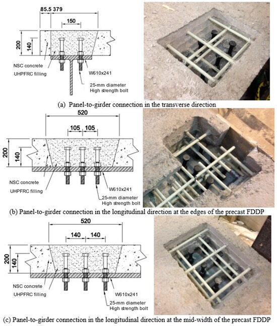 By 1974, FDDPs were made composite with the superstructure by extending the steel shear stud into the deck. FDDP was supported on girders and secured using shear studs embedded in the shear pockets normally filled with non-shrink grout to eliminate stress concentrations in the panels [3]. The transverse panel-to-panel connection has shear keys to protect adjacent panels from relative vertical movement due to traffic load. The panel-to-panel connection has several shapes, including the male–female shear key. However, cracking, spalling, and leakage were observed in such joints. Other panel-to-panel connections included a female-to-female shear key, which comes in bulb and diamond shapes [4,5,6,7]. The incorporation of longitudinal reinforcement was achieved using overlapping U-bars and HS spirals, or employing open or closed steel tubes [8,9]. Grouting materials have to be used to fill the shear pockets and transverse joints [10]. UHPFRC, as the filling material of the closure strip between connected FDDPs, has numerous benefits, including reduction of joint size, improved durability, speed of construction, and prolonged usage life [11,12,13,14,15].