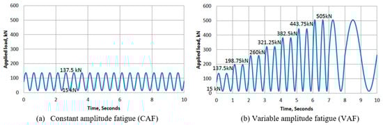 Traditionally, bridges are designed using static loads that include the dynamic load allowance (DLA) due to passing trucks at the ultimate, serviceability, and fatigue limit states. It is important to examine the structural behavior of the jointed precast FDDPs under different fatigue loading conditions, which lead to progressive, internal, and permanent structural changes in the materials. Two types of fatigue loading are considered in testing: constant amplitude fatigue loading (CAF) and variable amplitude fatigue loading (VAF). Fatigue loading is known to reduce the life span of the bridge deck [53]. Constant amplitude fatigue (CAF) is a classical method for fatigue analysis of the material to obtain the three fatigue resistance components for a structure, namely: stress-life (S-N) known as the Wöhler curve, strain-life (ԑ-N), and fatigue crack growth (FCG). CAF limit is the safe stress level under elastic deformation for the design that can take a very large number of cycles, more than one million cycles. The variable amplitude fatigue (VAF) limit investigates the effect of periodic overloading cycles. VAF is based on the same concepts, with the addition of cycle counting and damage summation due to increased step loading. However, the resulting stresses are high enough for plastic deformation to occur within the number of cycles, which is much less than one million cycles.