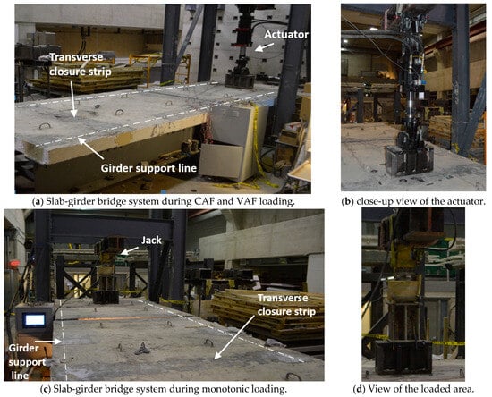 Using the available force-control hydraulic actuator system, the experimental program tested two precast FDDPs supported over a twin-steel girder bridge. The first precast FDDP system was tested under constant amplitude fatigue (CAF) loading, followed by increasing static loading to collapse. To collapse, the second precast FDDP system was tested under incremental step fatigue loading of variable amplitude (VAF). Table 2 presents a summary of fatigue-tested slab configurations. The constant-amplitude fatigue test is intended to examine whether the jointed slab can accommodate a minimum of two million cycles of fatigue loading without significant damage as an acceptance criterion per the Canadian Highway Bridge Design Code [2]. After the fatigue testing, the slab was statically loaded to collapse to determine its ultimate load-carrying capacity and compare it with the design wheel load for ultimate limit state design. The variable amplitude fatigue load test is meant to obtain fatigue test data to assist in developing a fatigue prediction model.