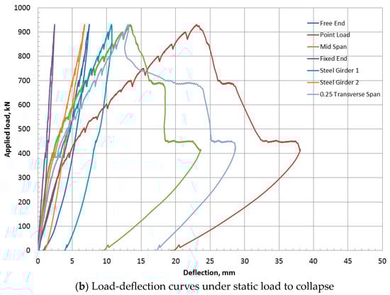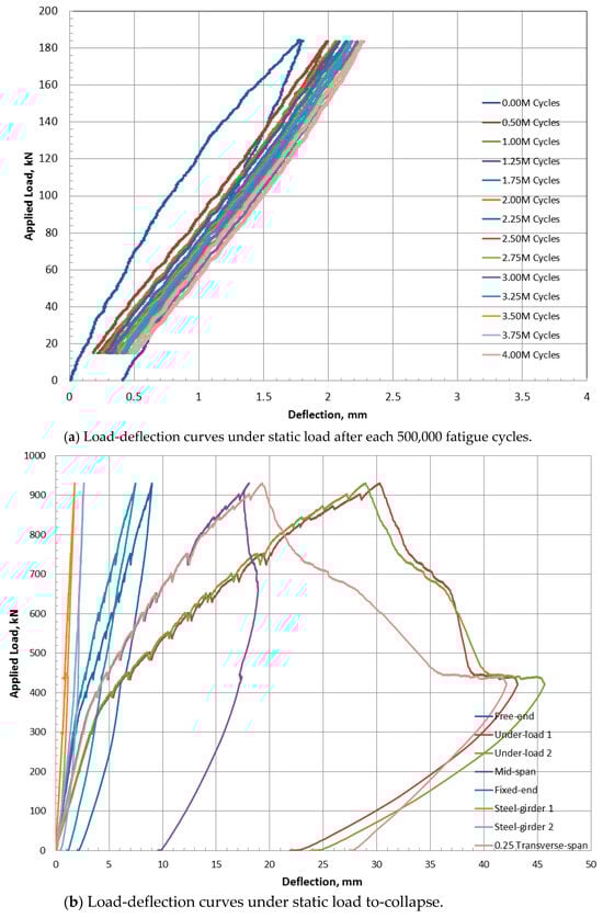 After each 500,000 cycles, the slab was subjected to monotonic loading to observe the change in slab flexural stiffness through deflection measurements. Figure 10a depicts the load-deflection relationship for the slab at the center of the footprint of the wheel load. It can be observed that the slope of the curves after each group of fatigue cycles appeared unchanged and stayed linear. After the 4 million fatigue cycles, the slab was subjected to increasing monotonic load to collapse. The precast FDDP failed due to punching shear at a jacking load of 931 kN, which corresponded to about 4.47 times the CHBDC factored design wheel load. Figure 10b depicts the load-deflection relationship for the tested slab under static loading to collapse. The deflection value was recorded at the mid-length of the free edge of the short slab, noted as a “Free end” that reached 1.78 mm at failure. On the other hand, deflections under the wheel footprint, denoted as “Under load 1 and load 2”, were recorded as 30.29 and 28.94 mm at failure, respectively. The deflection at the center of the long precast slab, denoted as “Mid-span”, was recorded as 19.30 mm. The maximum deflection of the long precast slab at the mid-length of the edge joint, denoted as “Fixed end”, was recorded as 2.65 mm at failure. Figure 8e presents the top view of the slab showing punching shear failure at the footprint of the wheel load, while Figure 8f presents the bottom view of the slab showing the crack pattern after failure.