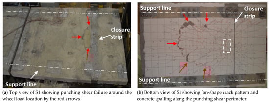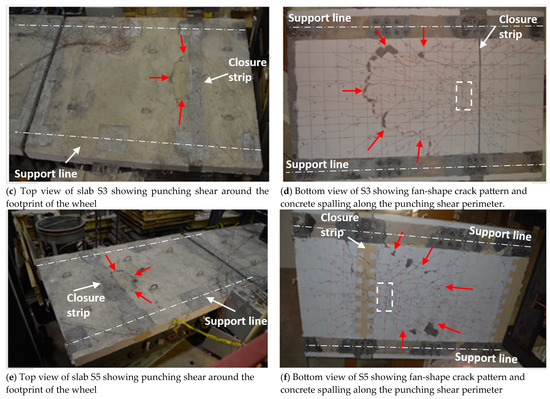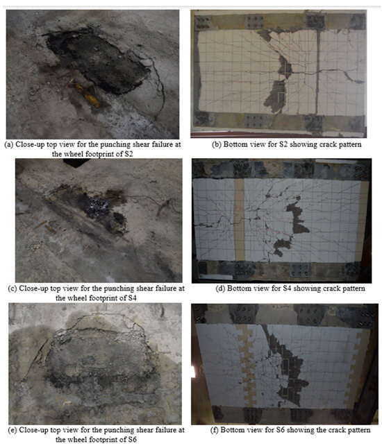 Interestingly, such a failure load is about 4.47 times the CHBDC factored design wheel load. Figure 8a presents the top view of the slab showing punching shear failure at the footprint of the wheel load. Figure 8b shows the bottom view of the slab showing a crack pattern after failure due to the fan mechanism. One may observe the radial cracks starting from the location of the footprint of the wheel load and propagating toward the support line in a fan shape. At failure, concrete spalling appeared in some parts of the bottom side of the slabs as signs of punching shear failure. However, such concrete spalling appeared only in the large FDDP slab, but it did not extend to the short FDDP segment on the other side of the closure strip.