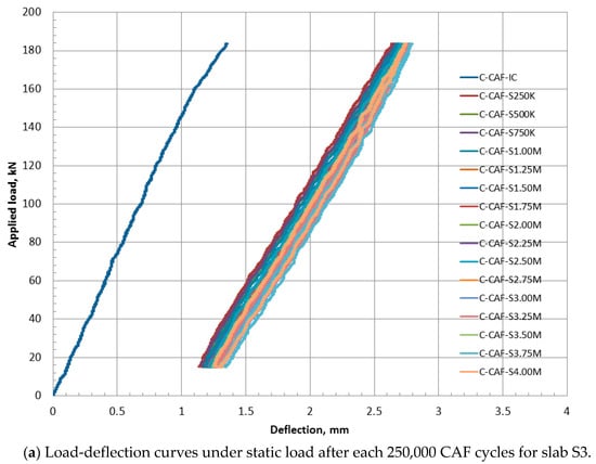 The first 501,002 fatigue load cycles were performed at a frequency of 2 Hz, then followed by 160,242 cycles at 1 Hz, and finally by 130,139 cycles at 0.5 Hz, leading to punching shear failure at a total number of cycles of 809,493. Figure 11a depicts the 60-mm-deep punching shear failure at the wheel footprint on top of the slab, while Figure 11b depicts the crack pattern at the bottom surface of the slab at failure. One may observe the radial cracks starting from the location of the footprint of the wheel load and propagating toward the support line in a fan shape. At failure, concrete spalling appeared in some parts of the bottom side of the large slab on one side only of the closure strip as a sign of punching shear failure. However, concrete spalling appeared to deviate from the traditional shape for punching failure (close to circular shape at the end of diagonal cracks through slab thickness). However, a major flexural crack appeared at failure just under the wheel load, extending in the direction of the girder towards the free end of the small FDDP segment while crossing the closure strip, as depicted in Figure 11b. This precast FDDP failed at a jacking load of 487.50 kN and a maximum slab deflection of 32.46 mm. It is worth mentioning that such a failure load is about 2.34 times the CHBDC factored design wheel load. Figure 12 depicts the monotonic load-deflection relationship of the slab S2 after each 100,000 fatigue load cycles. It can be observed that the slope of the curve decreased, leading to a reduction in slab flexural stiffness, with an increase in the number of VAF load cycles. Table 4 and Table 5 summarize the test data for all specimens with A-joints, C-joints, and Z-joints under CAF and VAF loading.
