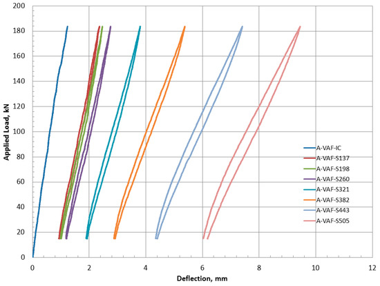 Static load-deflection curves of slab S2 with A-joint after every 100,000 cycles of VAF loading.