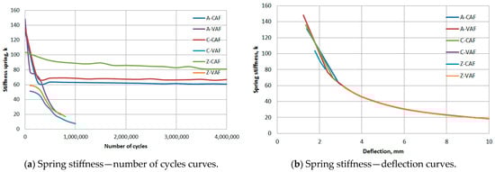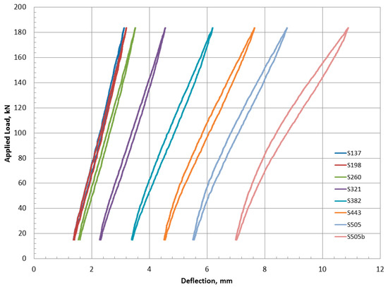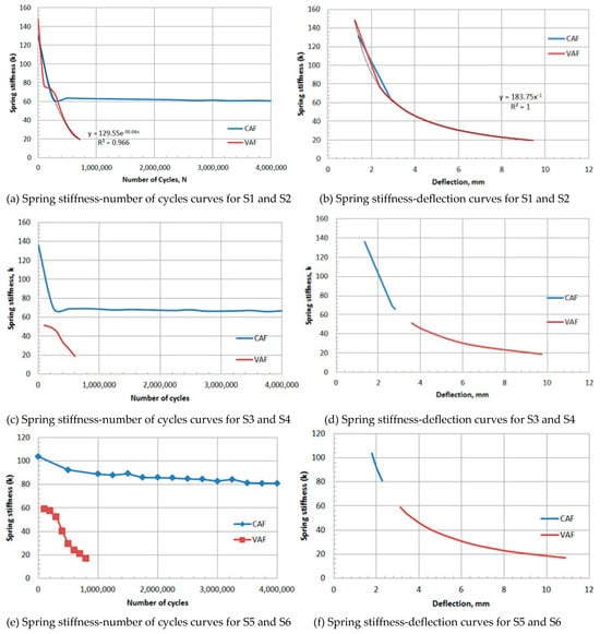 Table 6 summarizes the results for the CAF loading and for the VAF loading for precast A-Jointed FDDPs S1 and S2. Figure 15a,b depict the relationship between the spring stiffness and the number of fatigue cycles and slab deflection, respectively. One may observe that the specimen’s stiffness of S1 degraded by about 53.8% after 4 million cycles of constant amplitude fatigue loading. On the other hand, the specimen’s stiffness of S2 degraded by 86.86% when subjected to variable amplitude fatigue loading before complete collapse. Table 6 also summarizes the results for the CAF loading and the VAF loading for C-jointed precast FDDPs S3 and S4. Figure 15c,d depicts the relationship between the spring stiffness and the number of fatigue cycles and slab deflection, respectively, for S3 and S4. It can be observed that the first specimen’s stiffness (S3) degraded by about 50.73% after 4 million cycles of constant amplitude fatigue loading. On the other hand, the second specimen’s stiffness (S4) degraded by 63.24% when subjected to variable amplitude fatigue loading before complete collapse.