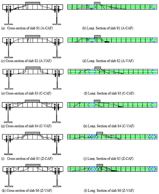 To obtain a comprehensive overview of the punching shear failure at each side of the loaded area, slabs S1, S2, S3, S4, S5, and S6 were sliced at the load location in both the transverse direction (normal to the steel girders) and the longitudinal direction. Figure 14 shows schematic diagrams of the punching shear failure in the tested slab when sliced longitudinally and transversally at the wheel load location observed after saw-cutting the slabs.