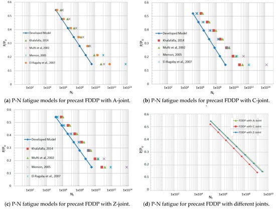 where equals 25.86, 24.32, and 25.609 for the A-Joint, C-Joint, and Z-Joint, respectively. Table 7, Table 8, Table 9 and Table 10 illustrate the fatigue data where D = 1 for all types of joints of the precast FDDPs. The proposed model to determine the P-N effect is shown in Equation (3), where K equals 0.039, 0.041, and 0.039 for the A-Joint, C-Joint, and Z-Joint, respectively. For static failure N = 1, the model yields to .