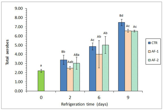A progressive increase (p < 0.05) in the pH value was detected in all batches as the storage time increased (Table 2). An increase in pH was derived from the presence of the alga extract in the packaging medium. Thus, higher average pH values were detected in samples corresponding to the CTR batch than in their fish counterparts subjected to the preservative extract; the differences were found to be significant (p < 0.05) on day 2 (AF-2 batch) and on day 9 (AF-1 batch).
