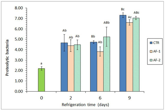 Determination of proteolytic counts (log CFU·g−1 muscle) in refrigerated mackerel subjected to different packaging conditions. Average values ± standard deviations (n = 3). The packaging conditions are expressed in Table 1. Different lowercase letters denote significant differences (p < 0.05) with chilling time; different capital letters denote significant differences (p < 0.05) as a result of the packaging condition. Time 0 corresponds to initial fish.